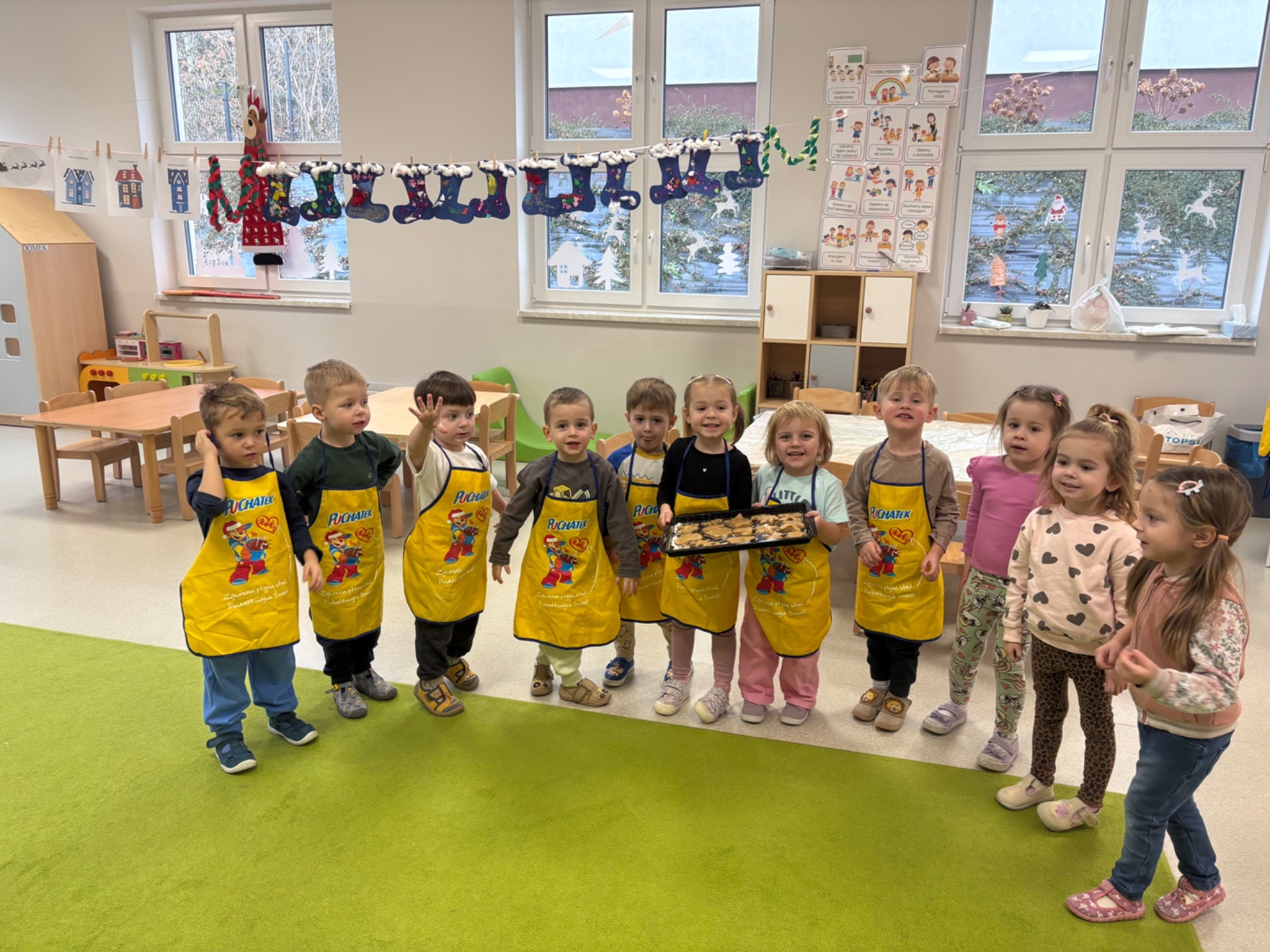 Grupa „Cukiereczki” z radością piekła i ozdabiała świąteczne pierniczki, które trafią na kiermasz. Podczas pracy dzieci uczyły się współpracy i poznawały bożonarodzeniowe tradycje, a aromat pierników wypełnił salę, wprowadzając wszystkich w świąteczny nastrój.
