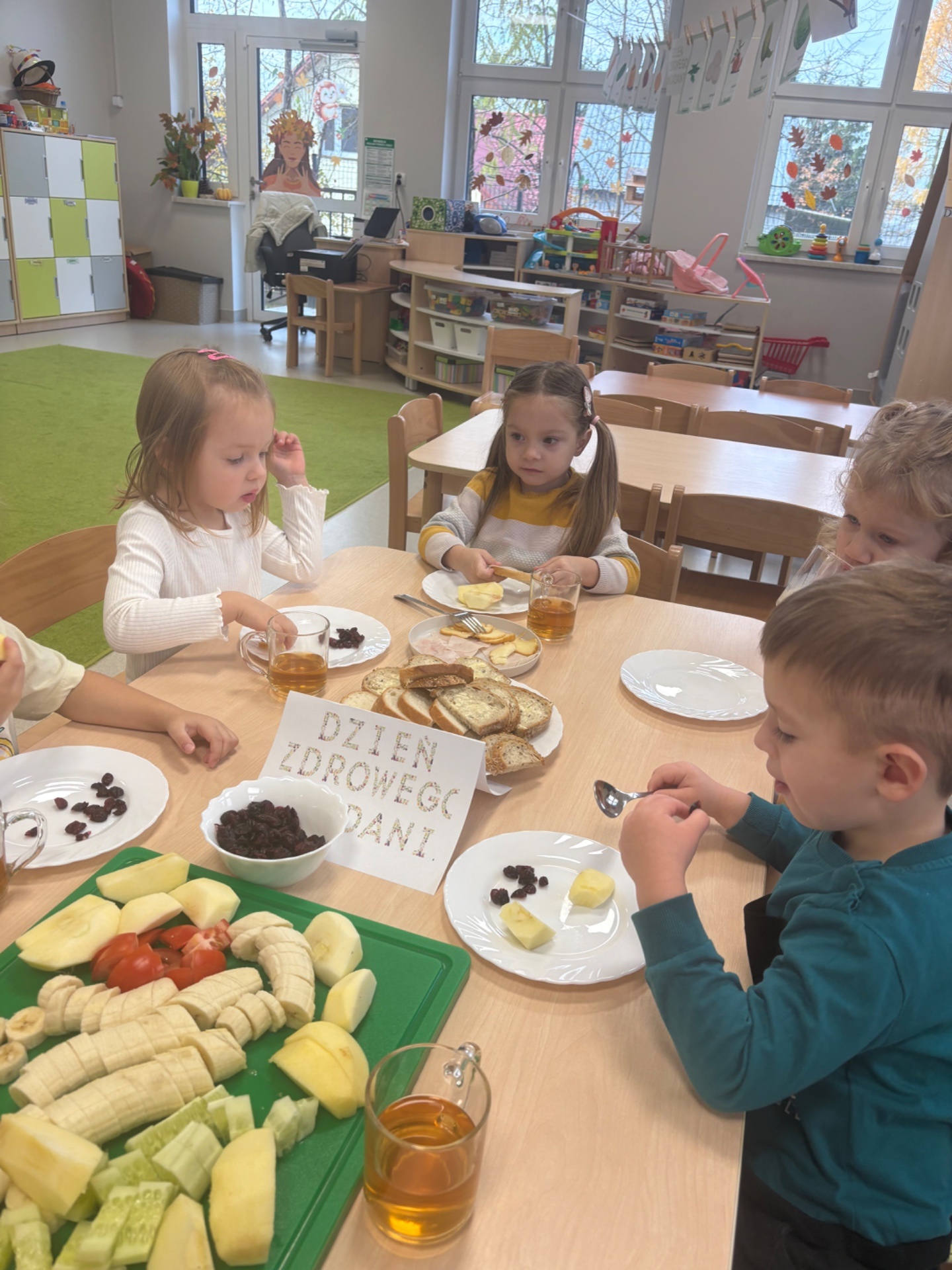 Następnie wspólnie zjedliśmy zdrowe śniadanie, a przy okazji porozmawialiśmy o tym, dlaczego warto sięgać po owoce i warzywa. Dzieci poznały piramidę zdrowego żywienia, dowiedziały się wielu ciekawostek o warzywach i owocach, a także uczestniczyły w różnych zabawach związanych z tematem dnia.
